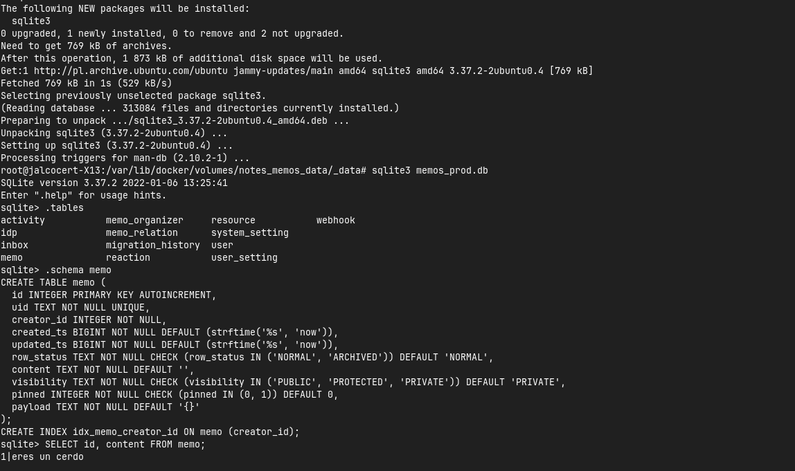 The Markdown content is inside the memos_prod.db file, structured within database tables.